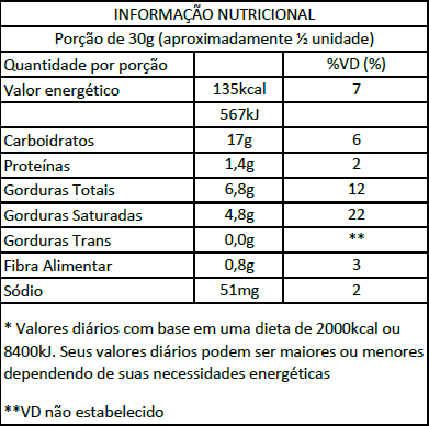 Açucar, farinha de trigo enriquecida com ferro e ácido fólico, gotas sabor chocolate ao leite (açúcar, óleo de semente de palma fracionado e hidrogenado, cacau em pó, leite em pó integral, soro de leite em pó, emulsificante lecitina de soja e triestearato de sorbitana e aromatizante), manteiga, farinha de aveia, ovo integral pasteurizado, gotas de chocolate meio amargo (açúcar, liquor de cacau, manteiga de cacau, gordura vegetal, gordura de leite anidra, emulsificante lecitina de soja e poliglicerol polirricinoleato e aromatizante), sal, fermentos químicos bicarbonato de sódio, fosfato monocálcico e pirofosfato dissódico e aromatizante. ALÉRGICOS: CONTÉM LEITE, OVO E DERIVADOS DE TRIGO, AVEIA, LEITE E SOJA. PODE CONTER TRAÇOS DE AMENDOIM, CASTANHA DE CAJU E NOZES. CONTÉM GLÚTEN.