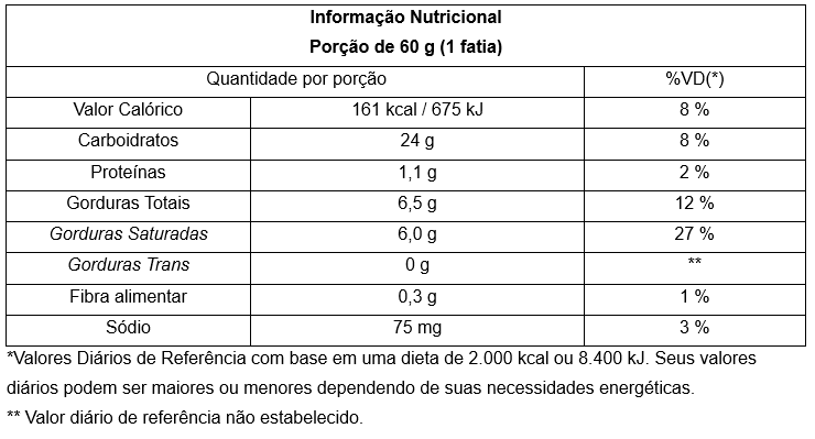 Creme vegetal tipo chantilly (Açúcar invertido, água, óleo de semente de palma hidrogenado, caseinato de sódio, proteína de soja concentrada, açúcar, sal, emulsificantes polisorbato 60, ésteres de ácidos graxos com poliglicerol e lecitina de soja, estabilizantes hidroxipropilmetilcelulose e goma xantana, aroma natural de creme, conservador sorbato de potássio, corantes naturais urucum e cúrcuma), pão de ló sabor chocolate (ovo, açúcar, farinha de trigo enriquecida com ferro e ácido fólico, amido de milho, cacau em pó, amido modificado, emulsificantes ésteres de ácidos graxos com poliglicerol e mono e diglicerídeos de ácidos graxos, fermentos químicos bicarbonato de sódio, pirofosfato ácido de cálcio e fosfato monocálcico, conservadores propionato de cálcio e ácido sórbico, corante caramelo IV, aroma artificial de baunilha e espessante goma xantana), calda sabor baunilha, cereja marrasquino sem cabo, confeito granulado sabor chocolate, cobertura fracionada de chocolate preto, cereja marrasquino com cabo e cobertura a base de açúcar.